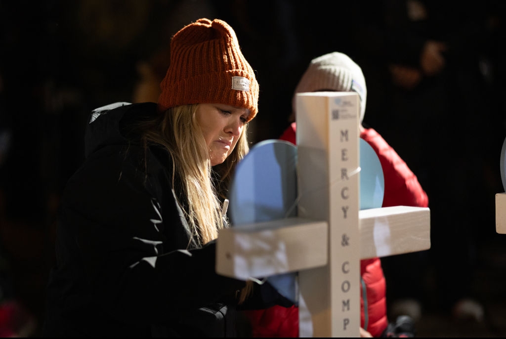 People leave messages on crosses during a vigil on the grounds of the state Capital building to mourn the victims of the shooting at Abundant Life Christian School . Credit: Scott Olson/Getty